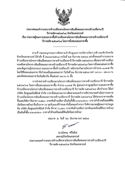 ประกาศคณะทำงานระบายข้าวเปลือกตามโครงการสินเชื่อชะลอการขายข้าวเปลือกนาปี ปีการผลิต 2567/68 จังหวัดนครสวรรค์ FACEBOOK TWITTER LINE